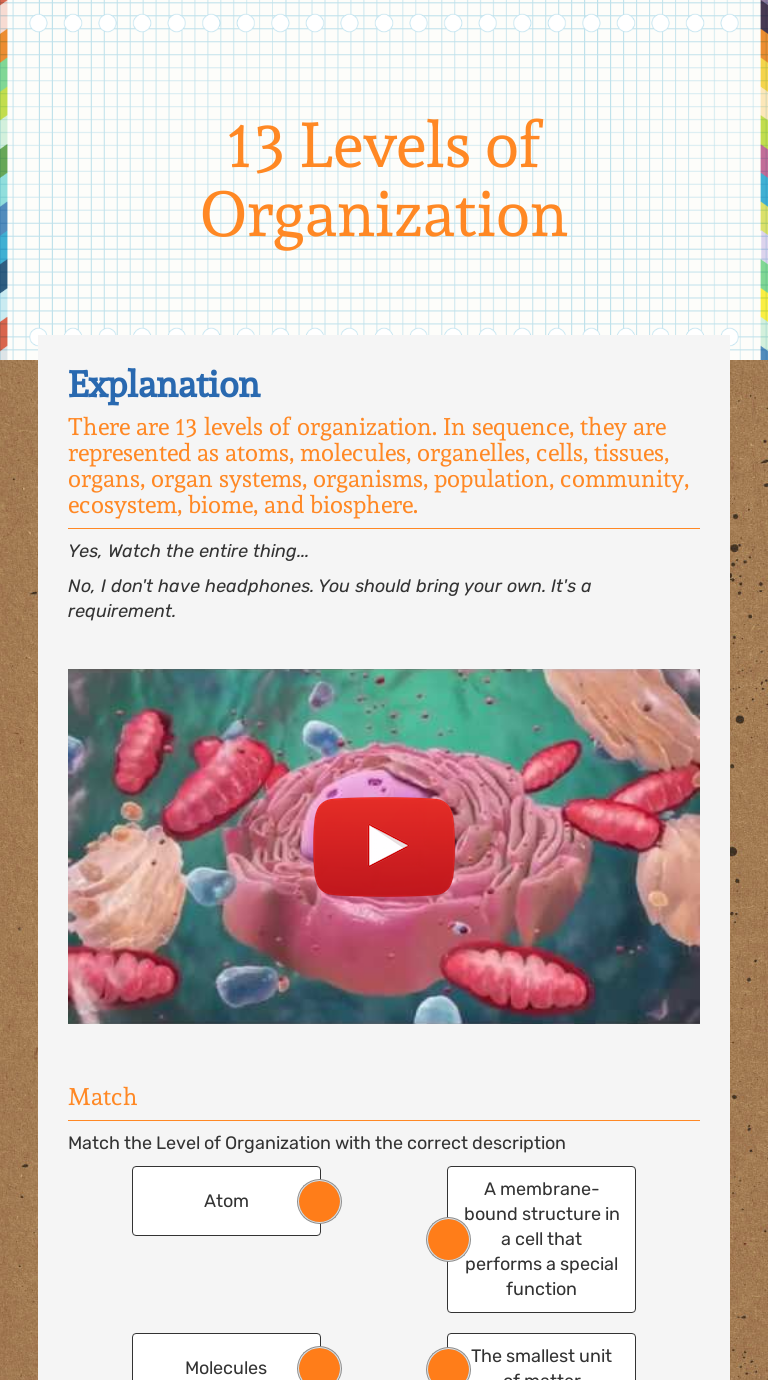 Levels of Organization. NOTES FOR STUDENTS. • This activity will be completed in groups of three. • Do not use the Internet or your textbooks unless ...4 pages