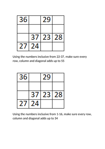 This worksheet has four 4x4 magic squares that require students to fill in the missing numbers so that the desired sum results. Good for addition practice.