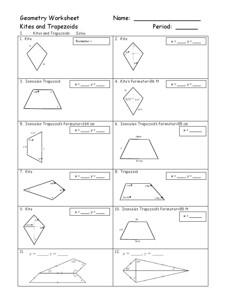 Geometry Worksheet Kites and Trapezoids Kites and Tra ezoids: Solve. Name: )Ars. Period: 2. 4. 6. 8. Kite 29 Kite's Perimeter:86 ft 1. Kite 12 20 3. Isosceles Trapezoid 128 Perimeter : 5x-15 2X+3 6y-2 Isosceles Trapezoid's Perimeter:85 cm 18cm 37 cm Trapezoid 5. Isosceles Trapezoid's Perimeter:164 cm Y+12 (7x)4fr y-12 7. Kite 47 9. Kite (4x-3Fy 59-4y 1154