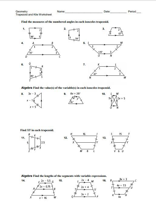 Geometry Name: Trapezoid and Kite Worksheet Date: Period. 2 me-I: me 2 rnLl hoc 2 t 2x+5 -l Find the measures of the numbered angles in each isosceles trapezoid. 960 1 $9' 470 550 2 ILS' 3 ILS' Algebra Find the value (s) of the variable (s) in each isosceles trapezoid. 8. 3x-3 Find XY in each trapezoid.