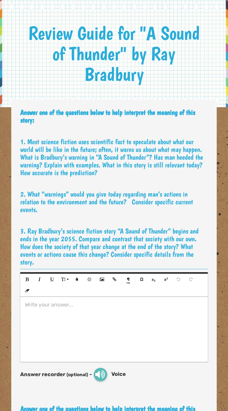 1. $2.00. PDF. This is a 32-page set of worksheets for the short story ";A Sound of Thunder" by Ray Bradbury. The comprehension questions can be used as a story test or as a learning activity for students as they read the story.The worksheets include: * comprehension questions (multiple choice)* comprehension ques.