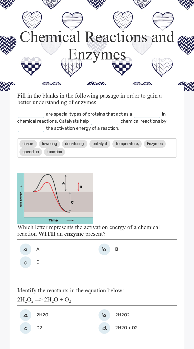 5. $2.00. Zip. Two worksheets, one pack!Use these two worksheets with easy to understand graphics and graphs to introduce chemical reactions (endergonic and exergonic), activation energy and enzymes. These are also great to use as a check for understanding after a lecture or lab activity.Use these worksheets with.
