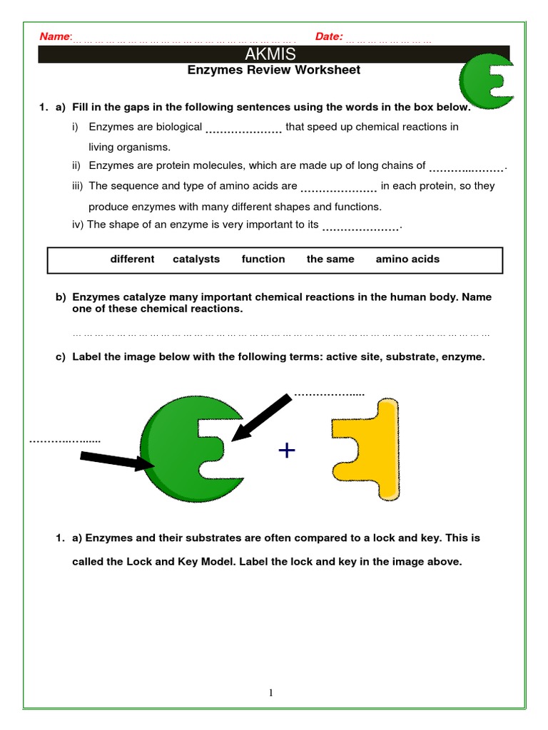 Enzymes Worksheet 1. a) Fill in the gaps in the following sentences using the words in the box below. i) Enzymes are biological ... Enzymes catalyze chemical reactions involved in important processes in the human body. Name one of these processes.