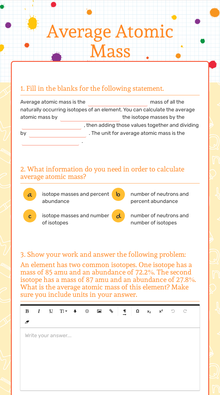 Free math problem solver answers your algebra, geometry, trigonometry, calculus, and statistics homework questions with step-by-step explanations, just like a math tutor. Calculating Average Atomic Mass Worksheet September 6, 2021 admin Students generally abash diminutive number, diminutive mass, diminutive weight and about diminutive mass. The afterward definitions may be helpful: Atomic cardinal is the cardinal of protons in an element. Name _____. Calculating Average Atomic Mass Worksheet. Show ALL calculation setups. The term "average atomic mass" is a _____average, and so is calculated differently, from a "normal" average.Explain how this type of average is calculated.