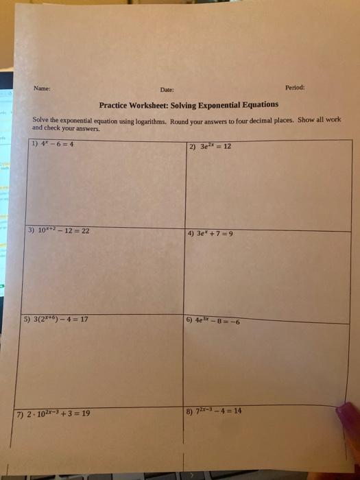 Solving Exponential And Logarithmic Equations Worksheet ... Showing top 8 worksheets in the category solving exponential and logarithmic equations. Solving exponential equations with logarithms. Solving exponential equations with logarithms date period solve each equation. Isolate the exponential part of the equation. Check your solution graphically. The meaning of logarithms.