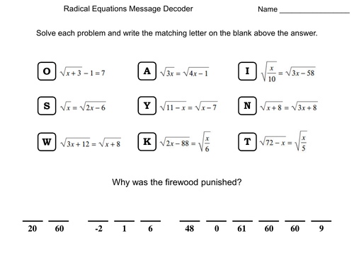 Solving radical equations worksheet. Radical Equations Worksheets How to Solve Radical Equations - Equations in Algebra are solved according to some rules. Once you have gained a command on those rules, solving an algebraic equation shouldn't be that difficult. However, in the case of any equation having a radical sign, things can be a bit different. solving equations worksheet | Forum ...solve a couple of solving equations worksheet questions that I am stuck on. I got a very low grade when I took the exam on solving equations worksheet. Here: . Dynamically Created Algebra 1 Worksheets - Math-Aids.Com We have twelve different topics covering Basic Skills, Domain and Range, Equations, Exponents, Inequalities, Linear Functions, Polynomials, Quadratic Functions, Radical Expressions, Rational Expressions, Systems of Equations, Trigonometry, and Word Problems for your use. Our Algebra 1 Worksheets are free to download, easy to use, and very flexible. Solving Radical Equations Examples of Solving Radical Equations. • Fact One: Radical must be alone before you apply the inverse operation. - Before you raise both sides of an Match each radical equation with its correct solution. Be sure to check for extraneous solutions. When finished, fill in the missing letters to decode...