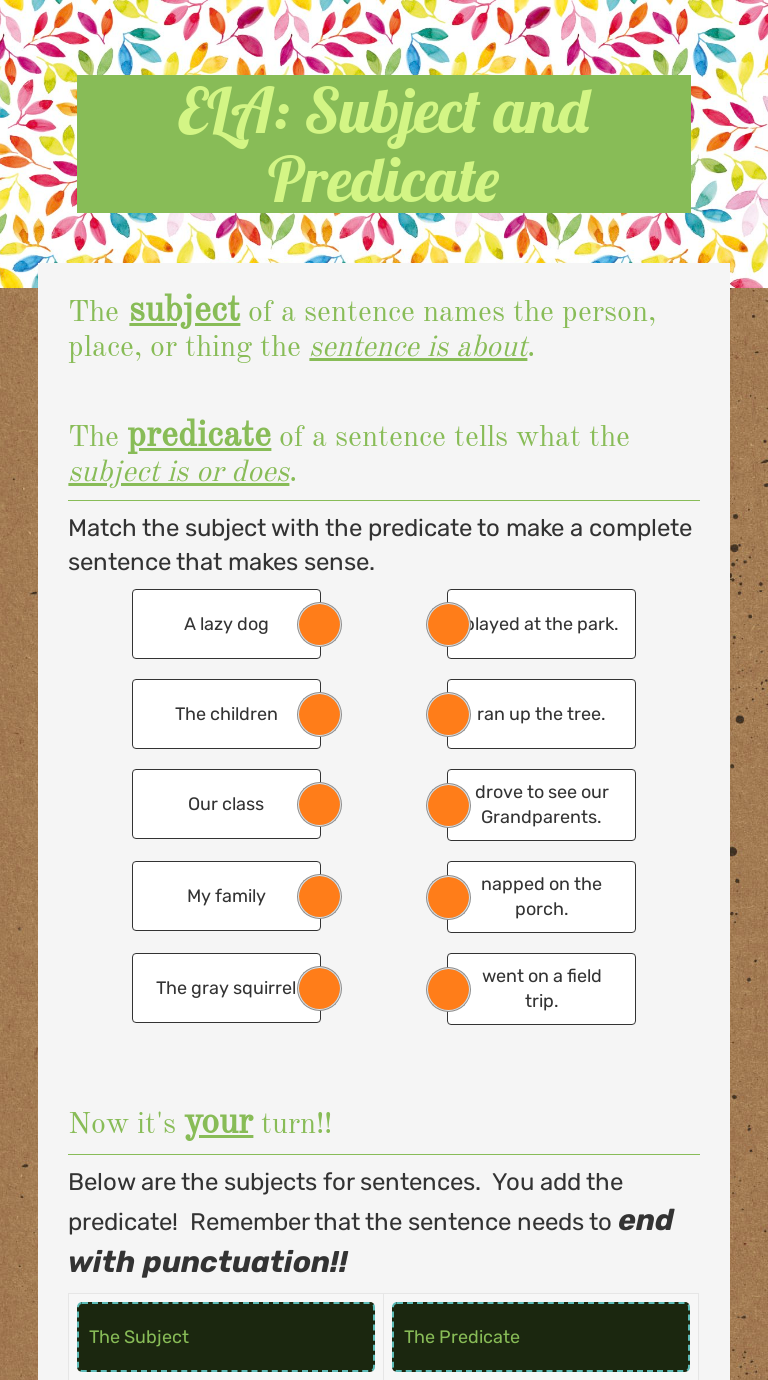 Subject and predicate interactive worksheet for 3 Live worksheets > English. Subject and predicate. Identify the subject and predicate of a sentence. ID: 1301876. Language: English. School subject: English as a Second Language (ESL) Grade/level: 3. Age: 7-8. Main content: Parts of a sentence.
