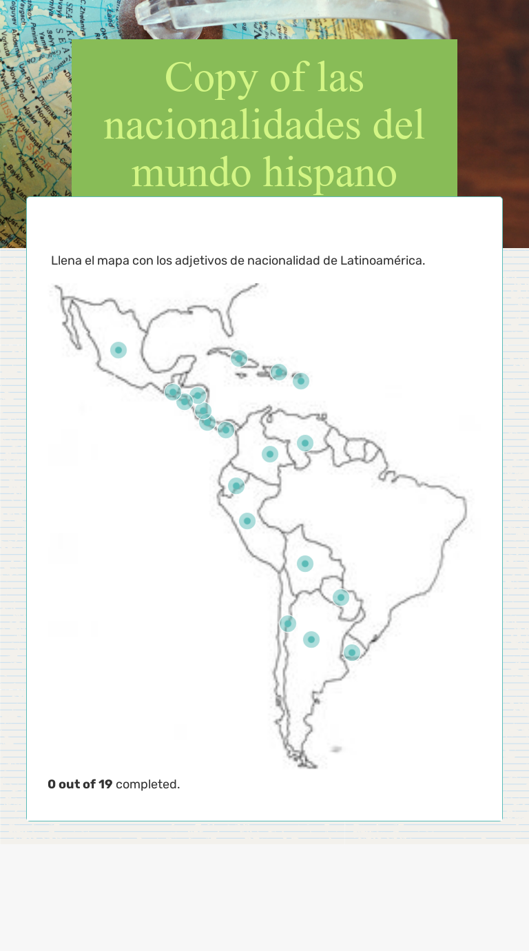 Capitales del Mundo Hispano Quiz - PurposeGames.com Selecciona en el mapa el país que corresponde a cada capital. ¡Diviértete! (Does not include Mexico, Spain, or Equatorial Guinea) ... This is an online quiz called Capitales del Mundo Hispano. There is a printable worksheet available for download here so you can take the quiz with pen and paper. From the quiz author.
