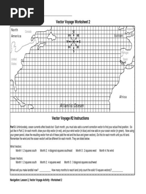 vector voyage 3 L.A..docx - Name Date Vector Voyage ... Name: Vector Voyage Worksheet Date: North America Canada Europe England United States Portugal Spain Cuba Atlantic Ocea n Africa Part 1: Landfill will be in New York, USA. It will take 3.5 months to reach land. Activity: Vector Voyage! - Massachusetts Institute of Technology Give each student a Vector Voyage Worksheet 1. Using the specified color of pencil, have them draw the 10 square movement vectors straight across the map and answer the questions on the worksheet. 2. Have the students redraw the 10 square movement vectors on the map while adding the wind vector corrections for each month. PDF Math 2940 Worksheet 1 and 1 2 form a coordinate for a new "grid system" that looks like this: where the red lines are parallel to 3 1 and the blue lines are parallel to 1 2 , and the original vectors are solid black. Note that this only works because our two vectors 3 1 and 1 2 are not parallel (i.e. they do not lie on the same line).