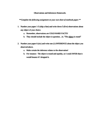 Observations vs Inferences Worksheet | Inference ... Observations vs Inferences Worksheet. Description Observations vs Inferences: Students look at a picture and decide if the given statement is an inference or an observation. Please visit my store for more products like this. White's Workshop Science Task Cards Energy Speed and Motion Magnet Pack Matter Rocks Space. Teachers Pay Teachers. PDF Observation vs. Inference - Natural History Museum of Utah c. Make simple predictions and inferences based upon observations Skills:Observing, inferring Lesson Objectives: For students to understand the difference between making an observation and making an inference. Vocabulary: Observation -things that can be clearly identified Inference -guesses based on evidence (observations and prior knowledge)