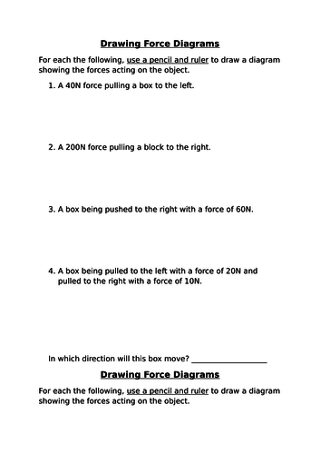 PDF Forces Worksheet 1 - St. Mary's Catholic High School ... 1. Name the following: i) A force that tries to slow things down when two things rub together . ………………….. ii) A force from water that pushes things up………………….. iii) A force that tries to slow things that are moving through air………………… iv) Not moving……………… v) When two forces working in opposite directions are not the same strength………………….. DOC Balanced and Unbalanced Forces Worksheet Describe the motion of the freezer. Two men of equal strength have a tug-of-war. Draw the forces that are acting onto the picture. Which man will win the tug-of-war? Leftor Right Another man joins each end of the rope. Does this affect the result of the tug-of-war? If not, why not? Another man joins the team on the left. PDF Forces Worksheet 1 Answer Key - cropover.nationnews.com Read Online Forces Worksheet 1 Answer Key Forces Worksheet 1 Answer Key Right here, we have countless book forces worksheet 1 answer key and collections to check out. We additionally give variant types and moreover type of the books to browse. The tolerable book, fiction, history, novel, scientific research, as with