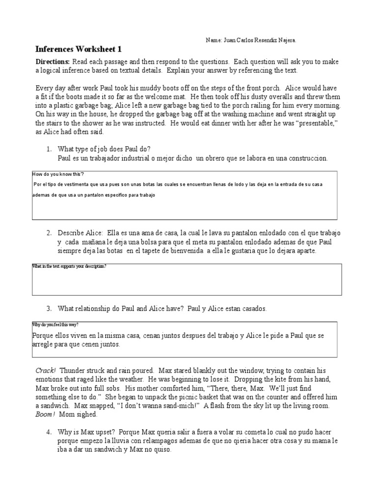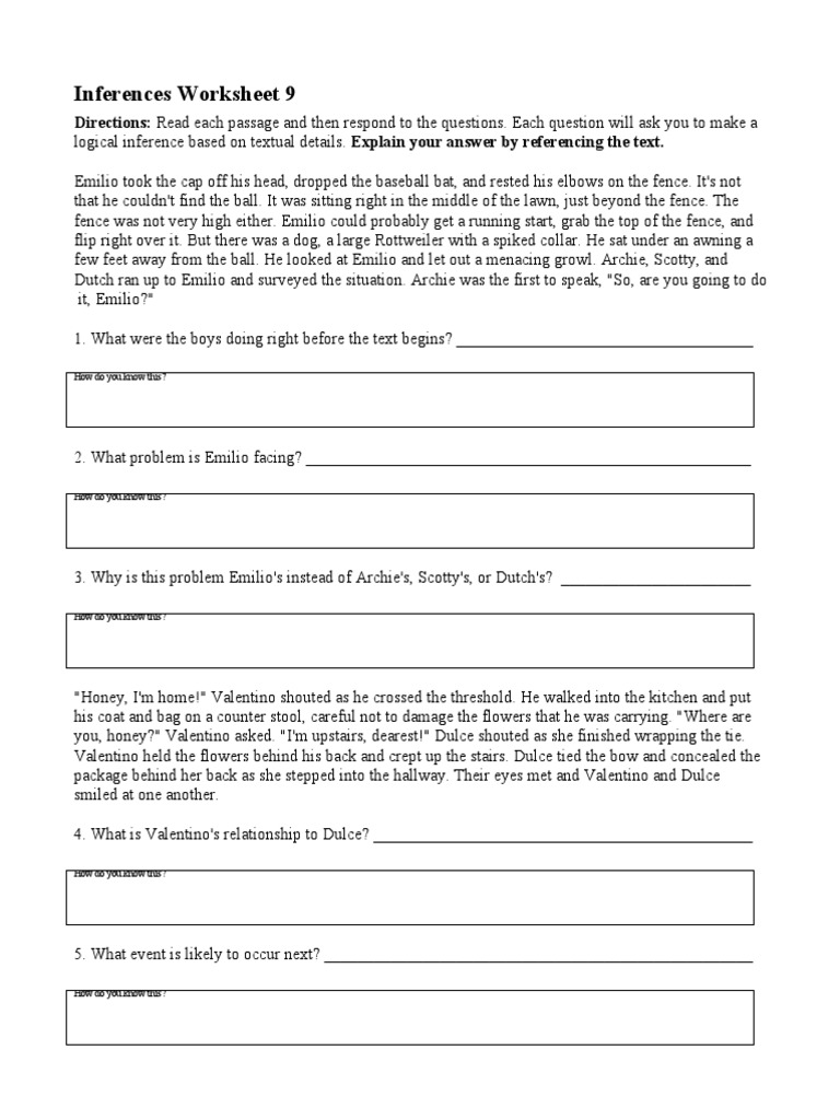 Inferences Worksheet 1 | Answers Inferences Worksheet 1 Directions: Read each passage and then respond to the questions. Each question will ask you to make a logical inference based on textual details. Explain your answer by referencing the text. Every day after work Paul took his muddy boots off on the steps of the front porch.
