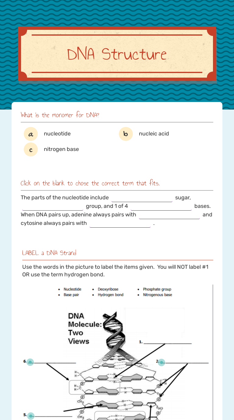 Dna Structure And Replication Worksheet Answers Dna structure and function worksheet answers. A Phosphate Group, A Five Carbon Sugar And A. Dna is a biomolecule found in living organisms, and whose function is to carry the. A nucleotide is made of three parts: This makes the bases inside the. Dna Replication Worksheet Pdf Reading Thermometers Worksheet Answer Key Chemistry 14.E: DNA Structure and Function (Exercises) - Biology LibreTexts 14.2: DNA Structure and Sequencing. The building blocks of DNA are nucleotides. The important components of the nucleotide are a nitrogenous base, deoxyribose (5-carbon sugar), and a phosphate group. The nucleotide is named depending on the nitrogenous base. The nitrogenous base can be a purine such as adenine (A) and guanine (G), or a ... Dna Structure And Replication Review Worksheet Answers DNA & Replication Worksheet 1. Write out the complete name for DNA: deoxyribonucleic acid 2. A nucleotide is made of three parts: a phosphate group, a five carbon sugar and a nitrogen containing base Label these three parts on the diagram to the right: 3. In a single strand of DNA, the phosphate group binds to the sugar of the next group. 4. Dna Structure Worksheet Teaching Resources | Teachers Pay Teachers DNA Structure, Function and Replication Review Worksheet by Biology with Brynn and Jack 4.8 (24) $3.99 Zip This EDITABLE 4 page worksheet asks students to review basic concepts in DNA structure, function, and replication. It includes identifying molecules, multiple choice, matching, fill-in-the-blank, and free response questions.
