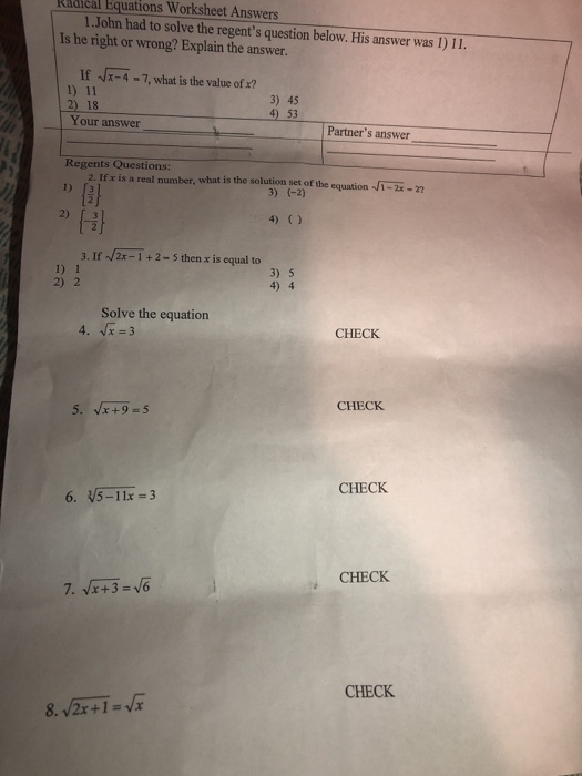 How to Solve Radical Equations? (+FREE Worksheet!) - Effortless Math Exercises for Radical Equations Solve Radical Equations. x√ +6 = 8 x + 6 = 8 x√ −7 = 4 x − 7 = 4 x +2√ = 10 x + 2 = 10 2 x − 9√ = 14 2 x − 9 = 14 2x − 5√ = x −1√ 2 x − 5 = x − 1 x +8√ = 2x +1√ x + 8 = 2 x + 1 x = 4 x = 4 x = 121 x = 121 x = 98 x = 98 x = 58 x = 58 x = 4 x = 4 x = 7 x = 7 Radical Equations