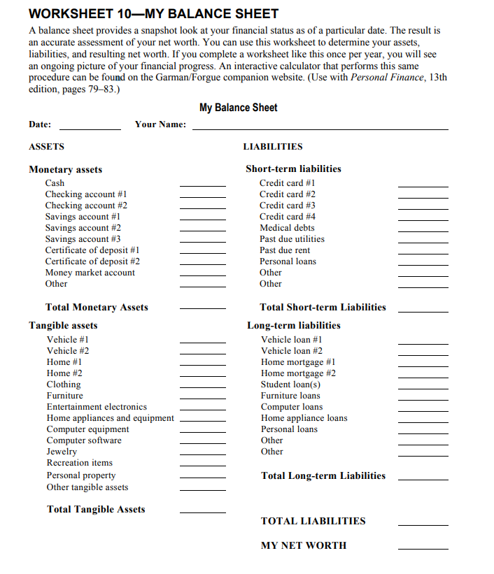 PDF Assets, Liabilities and Net Worth Worksheet - Michigan This Assets, Liabilities and Net Worth worksheet is what you use to calculate the difference between the total dollar value of what you own, (your assets,) and the total dollar amount of what you owe, (your liabilities.) Using this, you can calculate your net worth. And while this worksheet allows you to look at your assets and liabilities in a ... Asset And Liabilities Form Worksheets - K12 Workbook Asset And Liabilities Form. Displaying all worksheets related to - Asset And Liabilities Form. Worksheets are Assets liabilities work, My assets liabilities and net worth, Personal net worth work, Assets liabilities and net worth work, The balance work, Assets and liabilities work, Insolvency determination work insolvency out of, Assets income ... › assets › reallifeCreating a Personal Financial Plan - Missouri State University current assets. Assets are simply what you own that has value. These include: cash and cash equivalents, such as physical cash on hand, checking accounts, or savings accounts; personal property, such as equity in a home, other real estate owned, or a car; and invested assets, such as stocks, bonds, or pensions. › asset-liability-worksheetAssets and liabilities worksheet for couples - Canada.ca The assets and liabilities worksheet below can help you with this by showing you both your individual and combined net worth. Interactive Assets and Liabilities Worksheet for Couples [XLS - 54 KB] Download the Interactive Assets and Liabilities Worksheet for Couples (Microsoft Excel spreadsheet that does all of the calculations for you)