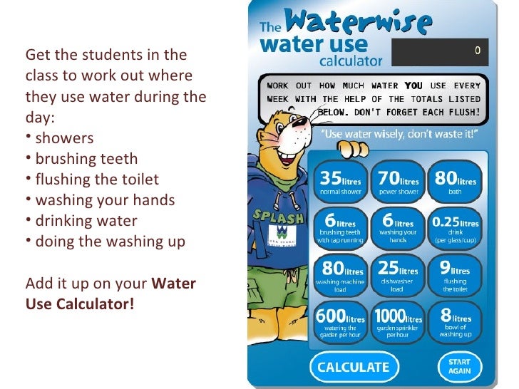 National and Local Weather Radar, Daily Forecast, Hurricane and ... The Weather Channel and weather.com provide a national and local weather forecast for cities, as well as weather radar, report and hurricane coverage Water Usage Calculator | Raleighnc.gov Water Usage Calculator. Updated: Nov 8, 2022. Water and Sewer Bill Assistance: Financial assistance for water bills is available through City and County programs: Utility Customer Assistance Programs . Share. Print. Contact . publicutilityinfo@raleighnc.gov Raleigh Water ... Water usage calculator - Anglian Water Services Water usage calculator Let's estimate your usage Find out how much water your household uses on average, and see how this compares to other similar homes based on the number of people living in your home. Complete the following questions to start saving water and money. Please note these are estimated prices based on 2022/23 charges. Personal water footprint calculator Personal water footprint calculator Based on your country of residence and your own consumption pattern, you will have a unique water footprint. Please feel free to use the footprint calculator to assess your own water footprint. To calculate your personal water footprint, we also offer an extended calculator: Extended Water Footprint calculator