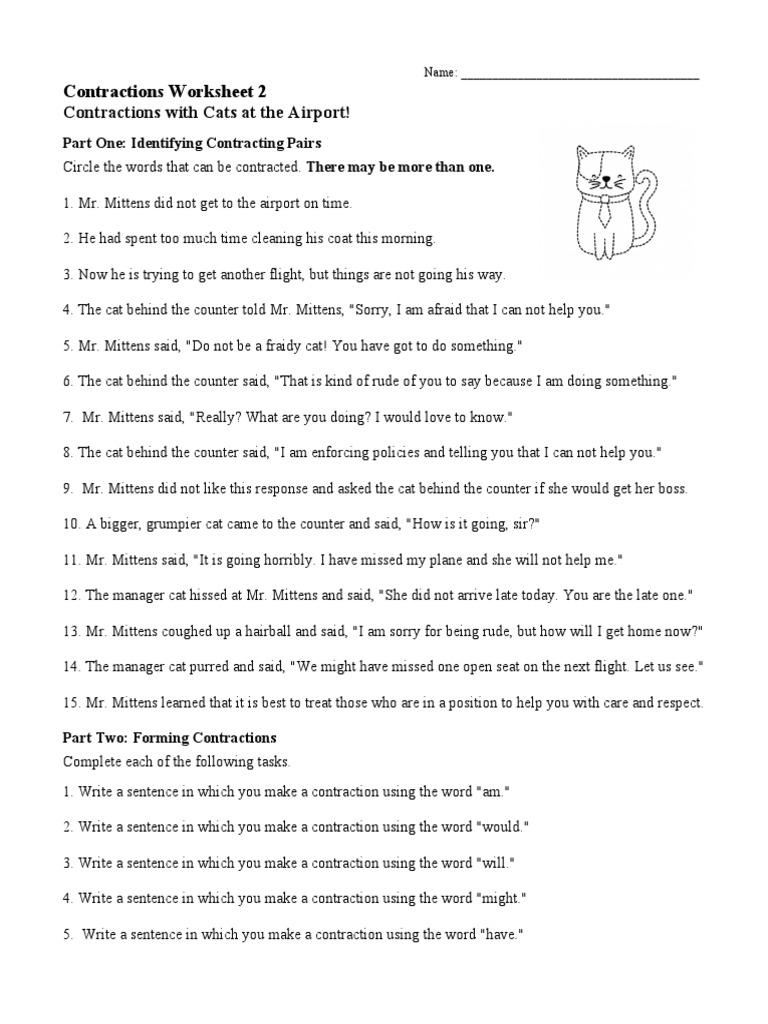 Contractions Worksheets and Activities Contractions Worksheet 1. In this contractions worksheet, students practice identifying and making contractions. This fun worksheet follows that adventures of a couple fictional cowgirls. This activity is available as a printable worksheet, an editable RTF file, or an online activity.